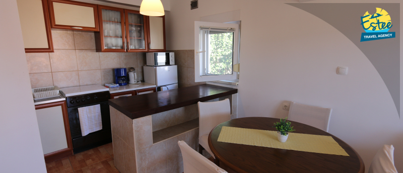 Stroj za kuhanje filter kave , Krpe za posuđe stoje na raspolaganju, Posuđe za jelo i kuhanje, pribor za jelo i sl. nalaze se u objektu, Pločice, Štednjak na struju i plin, Pećnica, Hladnjak i zamrzivač u jednom , Stol za jelo i stolice za sve osobe